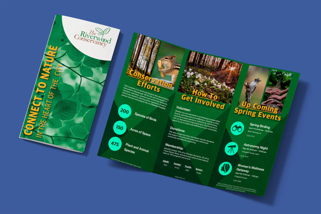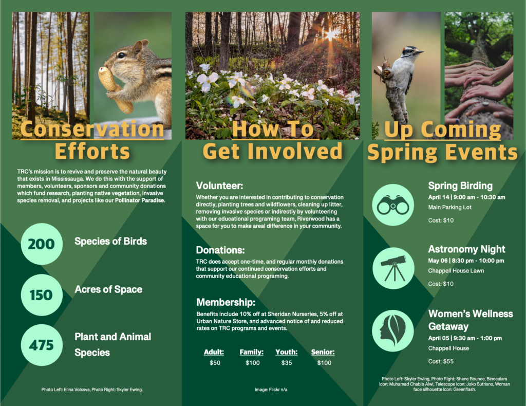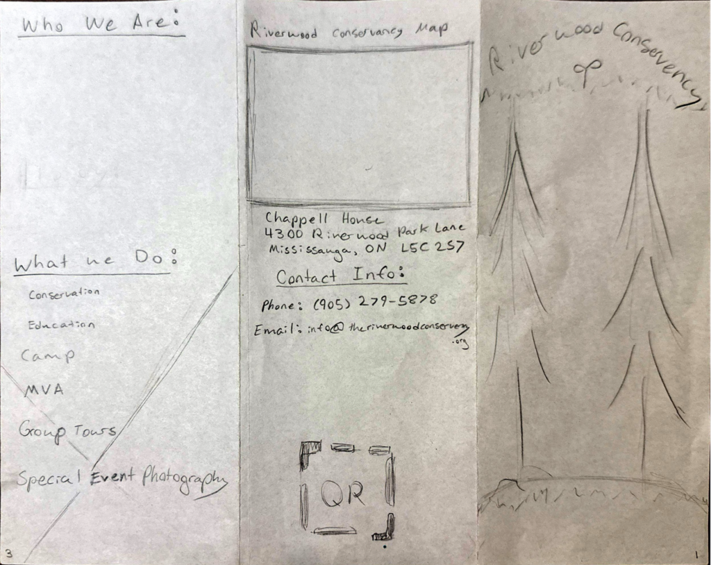 I began by researching the Riverwood Conservancy and determining the information that Mississauga residents who may have never heard of it before might want to know. I then did some rough sketches to work out the content of each panel, and the best placement of information and images.